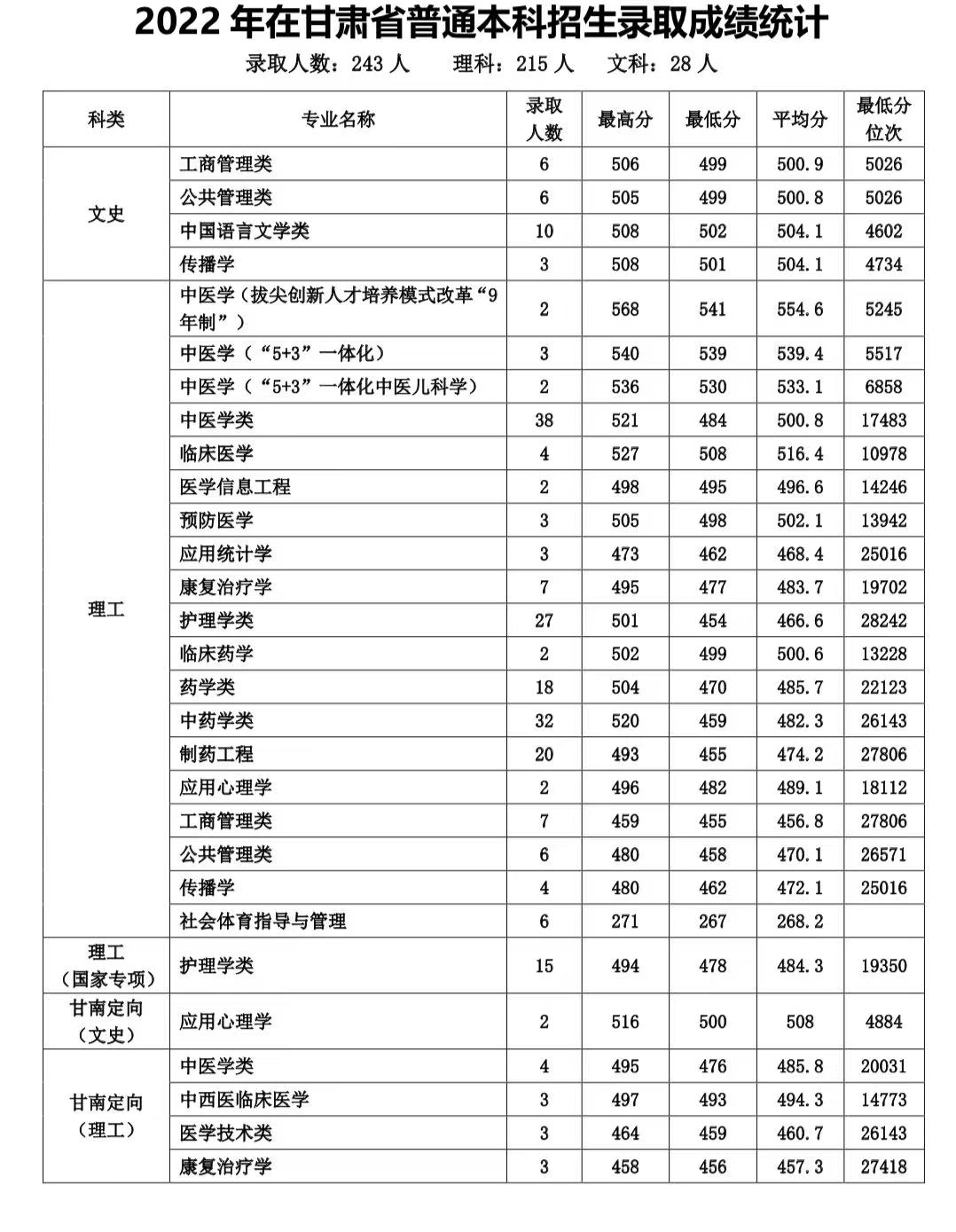 2022年在甘肃普通本科招生录取成绩统计